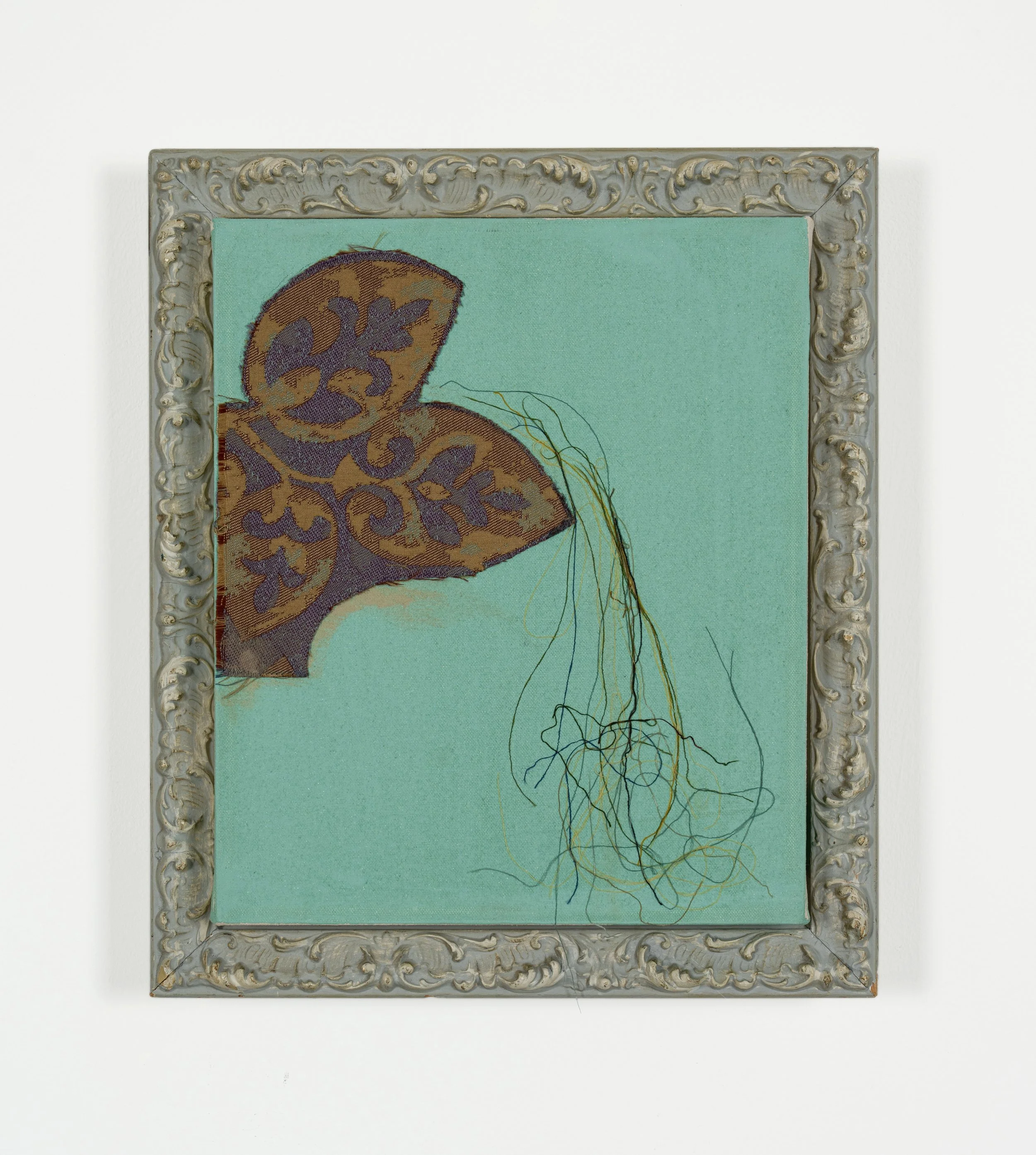 Tender Tendrils, Found fabric, fabric threads, Acrylic on canvas and found object, 12 x10 inches, 2024-25