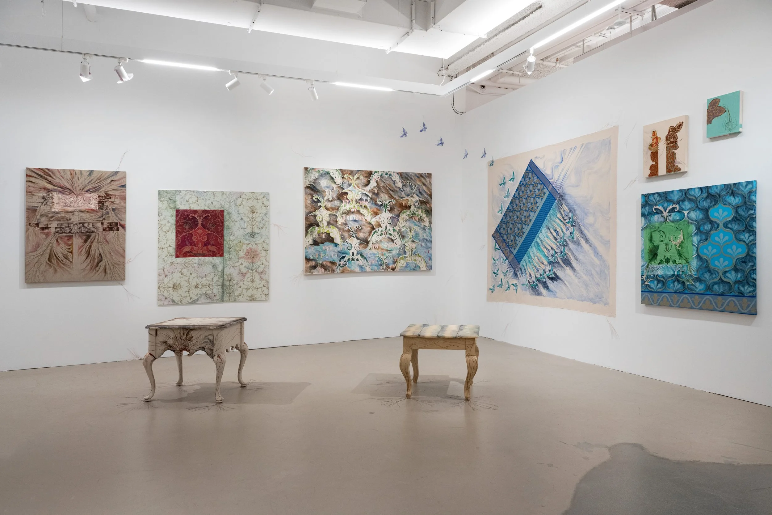 Decorative motifs resembling female anatomies—drawn from wallpaper patterns, fabrics, found furniture, and the architectural carvings of the artist’s immediate environment, such as brownstone facades—make their way into her paintings. She reimagines these floral baroque forms as abstract bodies, exploring their interiority and exteriority. She treats the body as a landscape of accumulated experiences, weaving personal mythologies by intertwining the intimate with the ornamental. In doing so, she challenges the conditioned self-image shaped by societal hierarchies of gender, caste, and diasporic dislocation. As she navigates this fragmented terrain of selfhood, she creates space for a multidimensional self—mapping and commemorating healing pathways from self-erasure to self-liberation.